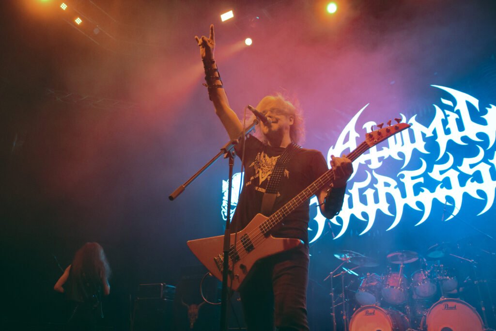 El público respondió con un ensordecedor “¡Atomic! ¡Atomic!”, mientras temas como “Dwellers of the Unknown” reforzaban la esencia extrema y primitiva de la banda.